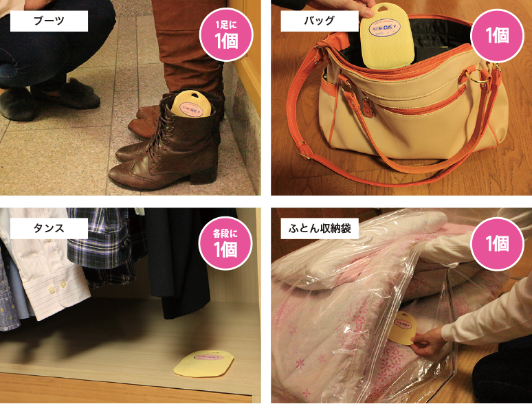 タンスや衣装ケース食料庫、ブーツ気になるところにポンッと置くだけ。