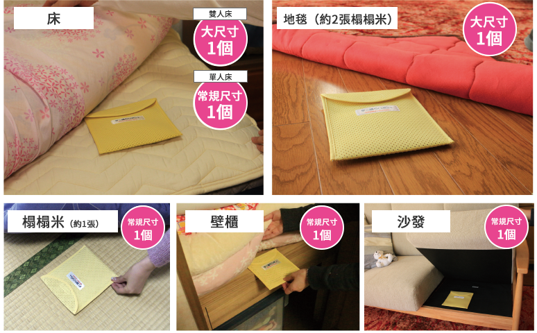 產品的內部放入了塵蟎喜好的引誘劑,其氣味會吸引室内的塵蟎(家塵蟎,姬螯蟎等)鑽入除蟎墊內。